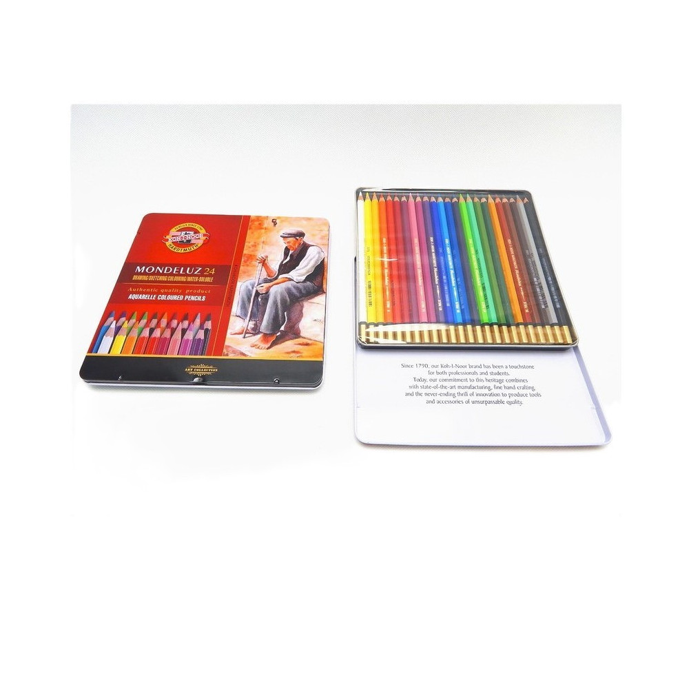 Umělecké akvarelové pastelky Mondeluz 24 kusů v plechovém obalu. Umělecká sada akvarelových pastelek. Vynikají světlostálostí, čistotou barev a barevnou škálou čítající až 72 různých barevných odstínů. Při aplikaci štětce a vody lze jejich stopu zcela rozmalovat a následně aplikovat techniku akvarelové kresby. Průměr 7 mm. Český výrobce Koh-I-Noor.