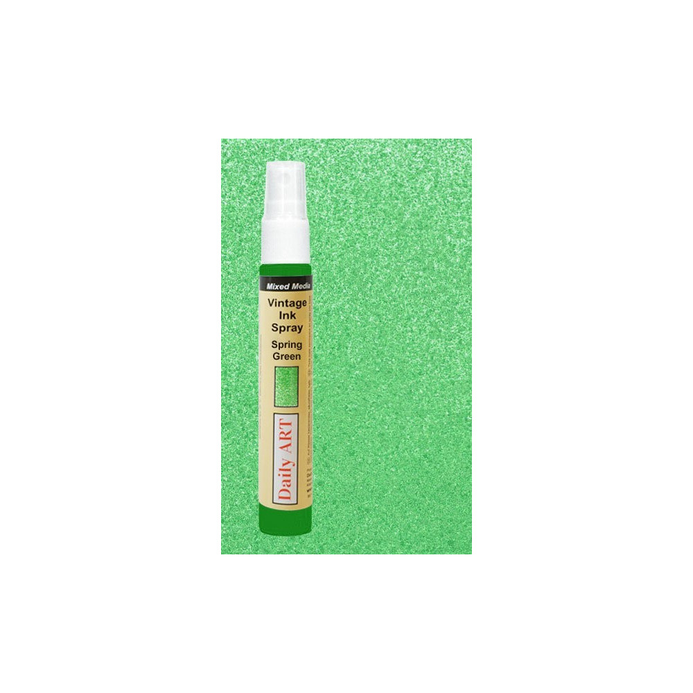 Inkoust na vodní bázi barva Zelená jarní. Mixed media, inkoustové barvy na bázi vody, bez kyselin. Vintage barvy na textil, ale také na různé jiné porézní materiály, například dřevo, lepenka, papír, cement, keramika. Dají se spolu různě kombinovat, míchat, (mixovat), přestříkávat se navzájem, čímž vzniknou další, zcela nové odstíny. Jsou v praktickém rozprašovači, do něhož se dá nalít další barva.